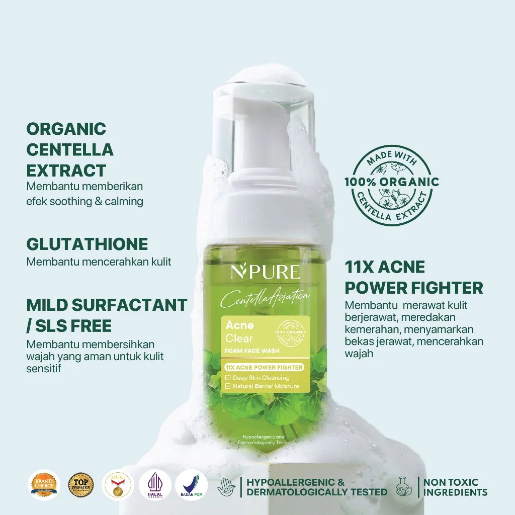 Facial Wash Anti Jerawat dengan Centella untuk Membersihkan Wajah Tanpa Membuat Kering   NPURE Centella Asiatica Facial Wash adalah sabun muka anti jerawat dengan formula non SLS yang dirancang untuk membersihkan wajah secara efektif tanpa merusak kelembapan alami kulit Pembersih wajah ini cocok digunakan sebagai langkah awal skincare routine bagi kulit berjerawat, berminyak, maupun kombinasi