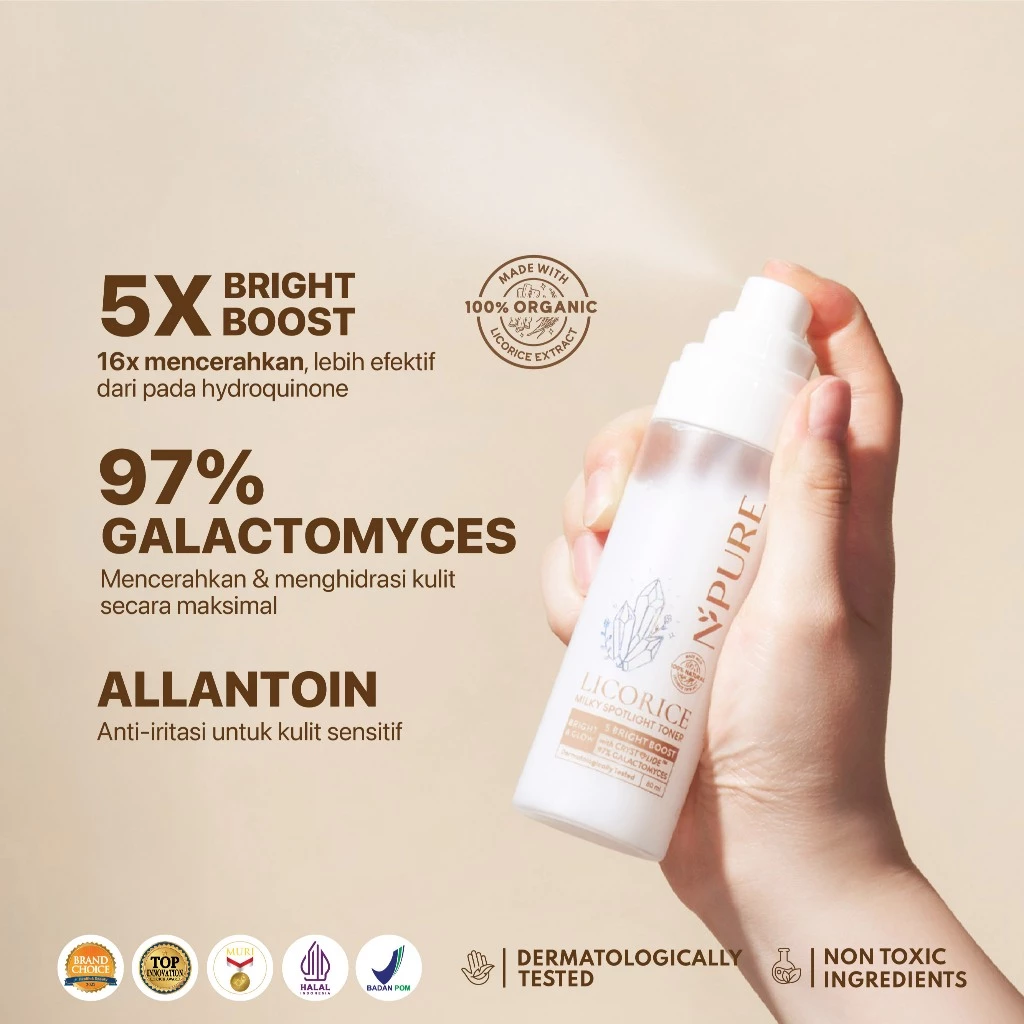 NPURE Licorice Milky Spotlight Toner adalah toner spray dengan teknologi fermentasi tinggi yang dirancang untuk membantu mencerahkan kulit secara bertahap namun konsisten