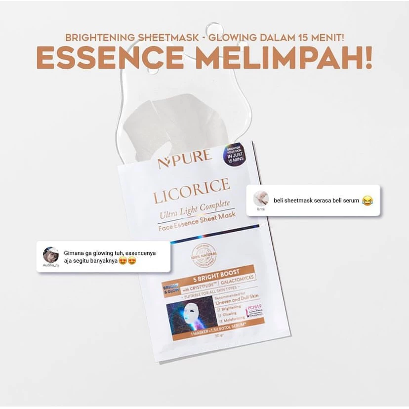 Masker Essence Ringan untuk Kulit Cerah Glowing Instan dalam 15 Menit   NPURE Licorice Ultra Light Complete Face Essence Sheet Mask adalah masker wajah dengan kandungan essence tinggi yang dirancang untuk memberikan efek cerah glowing secara instan Setiap lembar masker mengandung konsentrasi essence setara 1.5 botol serum sehingga mampu memberikan hidrasi dan pencerahan maksimal hanya