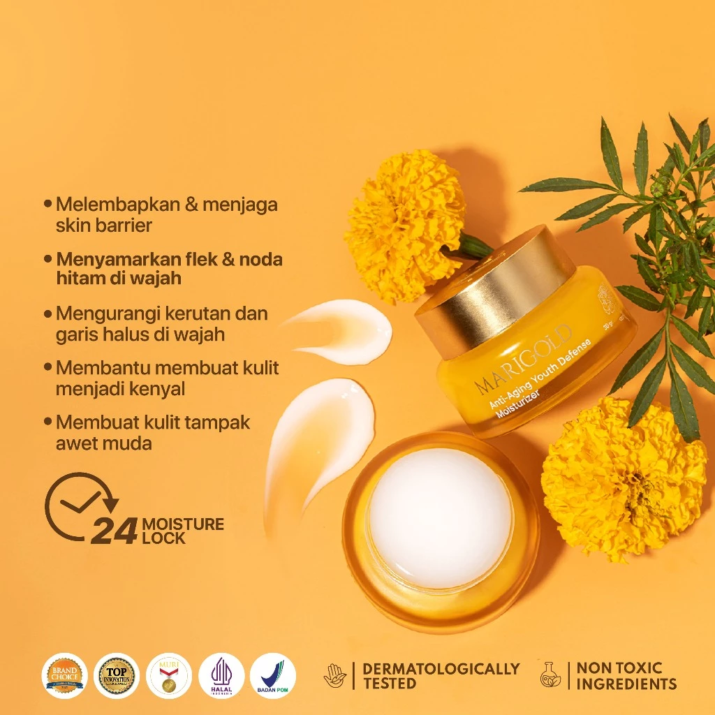 NPURE Marigold Anti Aging Youth Defense Moisturizer Aging Cream Flek Hitam Pelembap Awet Muda NPURE Marigold Anti Aging Youth Defense Moisturizer adalah pelembap bertekstur memory bounce yang dirancang untuk merawat elastisitas kulit menjaga kelembapan menyamarkan kerutan serta membantu mencerahkan wajah Dengan formula baru yang diperkaya Organic Calendula Extract, 8X Essential Vitamins, 5X Peptides, Vegan DNA,